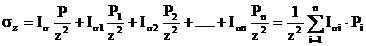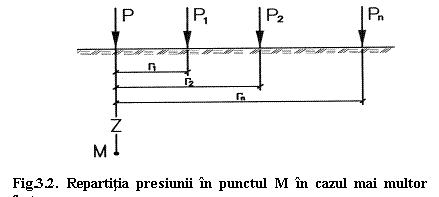 In cazul in care la suprafata terenului actioneaza mai multe forte P,P1,Pn, fig.7.2., presiunea repartizata intr-un punct M, din interiorul terenului de fundare,situat la adancimea z, se obtine prin insumarea presiunilor repartizate de fiecare forta in parte: