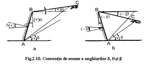 La aplicarea relatiilor 2.12 si 2.14 de calcul a coeficientilor Ka si Kp, unghiurile d q si b au semnele precizate in fig.2.10.