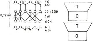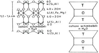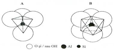 Mineralele argiloase sunt formate din strate de tetraedri de siliciu si octaedri de Al, Mg sau Fe. Configuratia tetraedrica rezulta prin dispunerea in jurul unui atom de siliciu a patru atomi de oxigen, iar prin dispunerea a sase atomi de oxigen si/sau grupari oxidrilice in jurul unui atom de Al, Mg sau Fe rezulta un poliedru, ce are o configuratie octaedrica (fig. 4). Prin asocierea stratelor de tetraedri cu cei de octaedri rezulta asa numita lamela sau foita a mineralelor argiloase. Asocierea se realizeaza in doua moduri: fie prin suprapunerea unui strat tetraedric cu unul octaedric si atunci rezulta minerale argiloase cu structura 1:1 (T:O), numite si minerale bistratificate (grupa caolinit – serpentina), fie prin cuprinderea intre doua strate de tetraedri a unui strat de octaedri, in acest caz rezultand minerale argiloase cu structura 2:1 (T:O:T), numite si minerale tristratificate (grupele micelor, smectitelor, vermiculitului sau cloritelor).