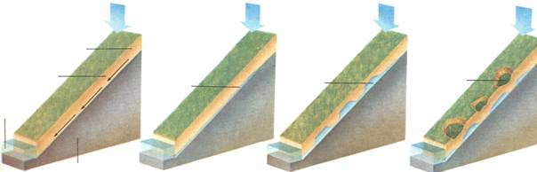 Eroziunea pe versanti. Eroziunea de suprafata se datoreaza scurgerii difuze pe versanti, a apelor din precipitatii, care spala un strat subtire de sol. În faza initiala acesta eroziunea este aproape imperceptibila. În cele din urma însa recoltele scad, deoarece solul devine mai putin fertil. Mult mai dramatica este eroziunea în adâncime, care, se produce mai ales, pe terenurile înclinate, unde scurgerea de suprafata se aduna în curenti, dupa o ploaie puternica devin torenti si taie santuri adânci în pamânt denumite ogase, ravene, torenti.