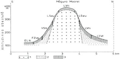 Fig. 12. Distributia solurilor pe Magura Mocrei (Dealurile Crisului). 1. Andezite; 2. Depozite coluviale; 3. Invelisul de sol. LSeu - Litosol eutric; FZvs - Faeoziom vertic; VSti - Vertisol tipic; ELti - Preluvosol tipic; LVti - Luvosol tipic; LVst - Luvosol stagnic. |