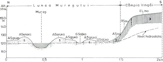 In functie de adancimea la care se gaseste nivelul stratului acvifer freatic este si intensitatea de manifestare a proceselor de gleizare in profilul de sol. Spre exemplu, in lunca, pe grindul de mal, unde apa freatica este la cca. 3 m adancime, sunt aluviosoluri entice, calcarice (ASen-ka), urmeaza o zona cu apa freatica la cca. 2 m adancime unde sunt formate aluviosoluri gleice, calcarice (ASgc-ka). Pe fostele brate parasite sunt formate gleiosoluri aluvice, calcarice (GSal-ka), aici stratul acvifer fiind la suprafata sau aproape de suprafata. Partea interna a luncii cu stratul acvifer freatic la 0,8-1,5 m adancime este ocupata de gleiosoluri aluvice eutrice (GSal-eu) si calcarice (GSal-ka) (fig. 14).