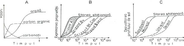 Timpul intervine si in realizarea diferitelor orizonturi ale solului (Birkeland, 1974). Primul care ajunge la starea stationara este orizontul A, apoi orizontul B cambic, urmeaza orizonturile B argic si C calcic, iar cel mai lung timp este necesar pentru orizontul B oxic (B feralic dupa WRBSR), apreciat ca poate depasi 1 milion de ani (fig. 15 B). In ce priveste realizarea profilului de echilibru pentru diferitele categorii de soluri (fig. 15 C), acelasi autor arata ca: Spodosolurile (podzolurile) sunt primele care ajung la starea stationara, urmeaza Molisolurile (cernoziomuri, faeoziomuri), apoi Ultisolurile (acrisolurile, dupa WRBSR), iar cel mai lung timp pentru a ajunge la starea de echilibru il necesita Oxisolurile (feralsolurile, dupa WRBSR).