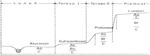 Pe formele de relief mai tinere, se constata ca profilul de sol are mai putine orizonturi fata de cele mai vechi. In lunca, solul are doar un scurt orizont A ocric, urmat de materialul parental, este ceea ce numim aluviosol. Pe prima terasa, solul, in afara de orizontul A ocric, prezinta sub acesta un orizont B cambic si mai jos roca parentala, acest sol este denumit eutricambosol. Pe terasa a II-a, intalnim un preluvosol, la care se diferentiaza un orizont B argic sub orizontul A ocric, iar pe nivelul superior, cel al suprafetei piemontului, s-a format un profil de sol mai complex, la acesta, intre orizontul A ocric si orizontul B argic s-a format un orizont luvic, solul, cu un profil alcatuit din orizonturile Ao - E - Bt - C, fiind denumit luvosol. Deci, putem spune ca luvosolul are o varsta mai mare decat preluvosolul, acesta din urma decat eutricambosolul si mai departe decat a aluviosolului.
