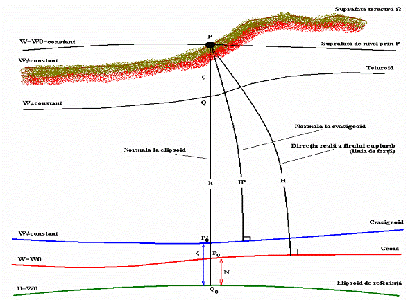 Figura 1. 1: Geometria solutiilor problemei valorilor la limita ale potentialului date de Stokes si Molodensky (relatia dintre ondulatia geoidului - N, altitudinea ortometrica - H, anomalia altitudinii - ζ si altitudinea normala - H')