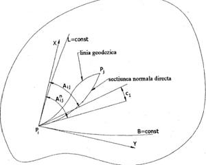 Se considera un punct de statie Pi din care s-au efectuat observatii azimutale catre alte puncte printre care si punctul Pj. Trebuie sa se determine o corectie, datorata necoincidentei intre sectiunea normala directa (normala la elipsoid in punctul considerat si punctul vizat) si linia geodezica (linia curba cea mai scurta dintre doua puncte situata pe o suprafata oarecare, avand ca si caracteristica principala unicitatea), pentru a trece de la sectiunea normala directa la linia geodezica.Aceasta corectie, notata cu c1 din figura alaturata, mai este cunoscuta si sub denumirea ,,corectia de linie geodezica'', in care :