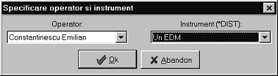 Înainte de preluarea efectiva a fiecarui grup de masuratori, utilizatorul va trebui sa precizeze operatorul si instrumentul, prin alegerea acestora din listele de operatori si instrumente