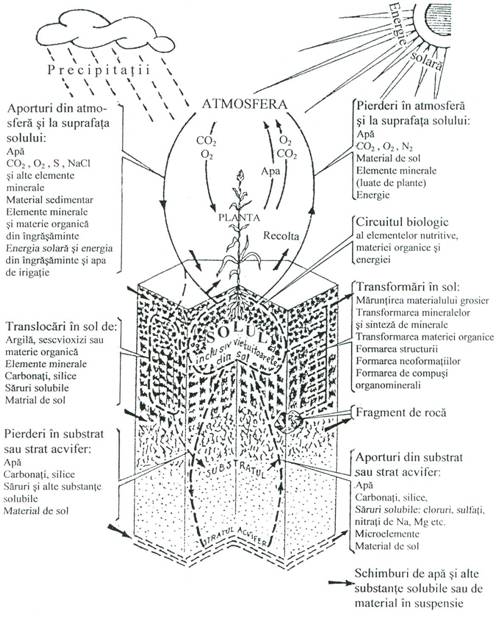 Datorita faptului ca solul este un sistem complex, avand interactiuni cu celelalte sisteme, el participa la producerea de fitomasa, influenteaza capacitatea de productie a ecosistemelor, avand o contributie esentiala in recircularea elementelor chimice in natura si regleaza compozitia atmosferei si hidrosferei (fig. 1). Fiind format la suprafata scoartei de alterare, solul contribuie la stabilitatea reliefului prin protejarea stratelor adanci ale scoartei. In acelasi timp, datorita proprietatilor lui fizice, chimice, mineralogice sau biologice, solul are o actiune de atenuare a variatiilor bruste, care pot, uneori, interveni in unele caracteristici ale sale, precum si de filtrarea si epurarea diverselor substante poluante.