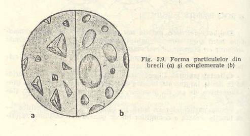Textura: psefitica, dimensiunea particulelor 2.4 mm in cazul microconglomeratelor. Pentru conglomerate grosiere diametrul galetilor > 64mm. De obicei sfericitate buna. Forme alungite, sferice si subsferice cu suprafata neteda.
