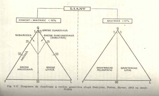 -dupa modul de formare: ciment (prin precipitare si/sau recristalizare, ex. Gresii cuartoase) si matrice (prin sedimentare si/sau alterare, ex. Graywacke)