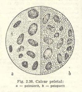 Textura: psamitica. Dimensiunile peletelor variaza de la milimetri la centimetri. Forma ovoidala, rotunjita si subrotunjita. In sectiuni prezinta texturi nediferentiate sau concentrice.