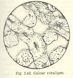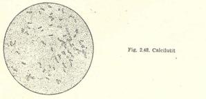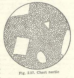 Macroscopic: in stare proaspata, se prezinta depozite compacte, cu aspect sticlos, divers colorate (galben, brun, negru). Prin alterare devin albe sau galbene si capata aspect cretos.