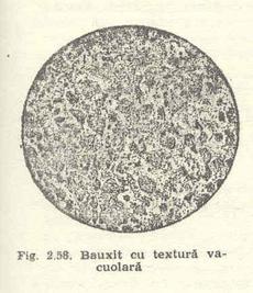 Textura: aspecte texturale foarte variate, omogene si neomogene, "patate" sunt date de corpusculi, de diferite forme si origini, prinsi intr-o masa fundamentala. Texturile omogene caracterizeaza rocile compacte sau cele poroase, spongioase. Pentru acestea din urma sunt specifice texturile veziculare, cu goluri mari, tubulare sau vermiforme si texturile celulare, cu cavitati mari formate prin solubilizari selective. Texturile pamantoase sunt caracteristice unor depozite friabile de tipul terra-rossa. Texturile scheleticesunt microgranulare si reflecta caracterele rocilor pe seama carora au aparut bauxitele. Texturile colomorfe (geliforme) sterg texturile scheletice si capata aspecte mamelonare, globulare cu imbogatiri in aluminiu si fier. Texturile nodulare constau din aglomerari mineralogice neregulate, cu aspect concretionar, diseminate in masa fundamentala. Texturile brecioase sunt date de fragmentele angulare, dispersate in masa fundamentala (care capata caracter de matrice). Texturile oolitice, pisolitice si concretionare se intalnesc frecvent in bauxite.