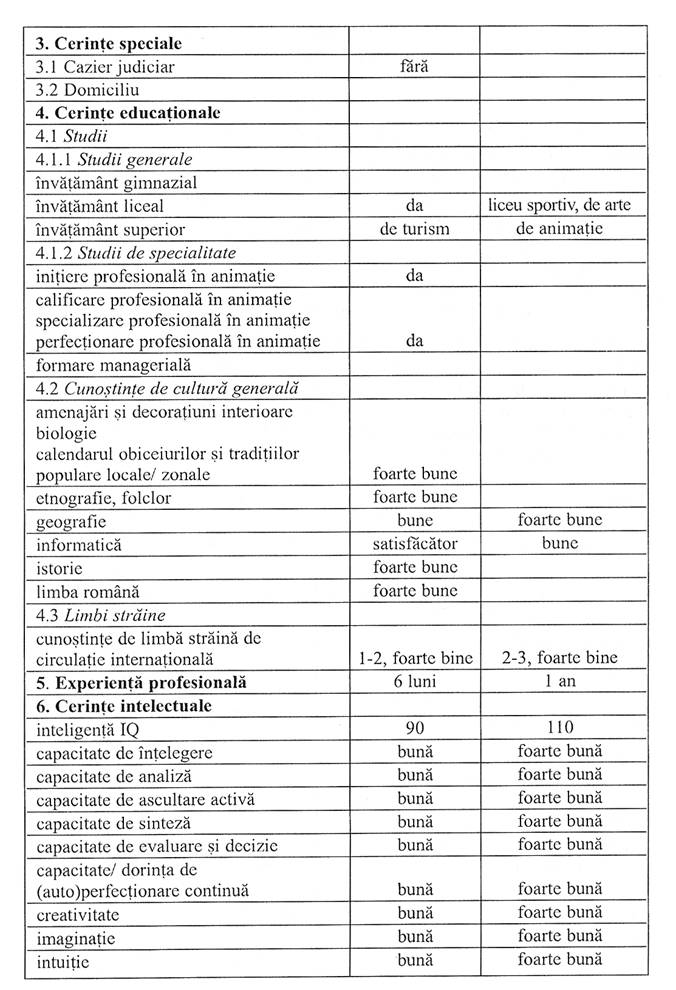 Se prezinta, în continuare, cerintele pe care trebuie sa le îndeplineasca candidatii care urmeaza sa fie pregatiti pentru activitatea de animatie, competentele ce trebuie dobândite prin pregatire, precum si atributiile animatorului, asa cum sunt prevazute în STANDARDUL PROFESIONAL REFERENŢIAL, elaborat de THR-CG, marca înregistrata la OSIM sub nr. 045219 si publicata în M.O. nr. 9/2001.