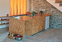 In ceea ce priveste mobilierul, acesta presupune doar cateva piese, adica minimul necesar: tabureti, canapea, masa si etajere - in living, blat de bucatarie si paturi - in camere. Mobilierul din living si din bucatarie este realizat din placi de OSB neprelucrate, iar paturile sunt din diferite esente lemnoase.