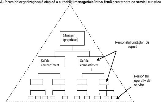Noul concept de livrare a serviciilor turistice a provocat în ultimii ani modificari substantiale în structura organizatoricǎ a întreprinderilor de turism, concretizate prin reproiectarea piramidei organizationale, caracterizata prin sintagma: "turning the pyramide upside down" (în traducere libera: rasturnarea piramidei cu vârful în jos), ilustrat grafic în fig. 3.