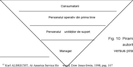 La baza piramidei, respectiv la vârful piramidei inversate, se situeaza managerii firmelor, a caror functie nu mai consta în transmiterea comenzilor catre personalul operativ, ci în sprijinirea acestui personal pentru preformarea serviciilor orientate catre nevoile si preferintele de consum ale clientilor.