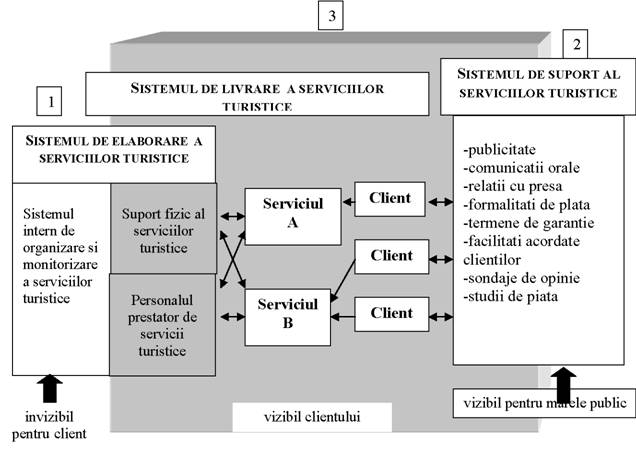 Practic, pentru client sistemul de elaborare si sistemul de suport al serviciilor turistice sunt vizibile numai partial, pe câta vreme sistemul de livrare a serviciilor se bucura de o transparenta totala în fata clientului (fig. 4).