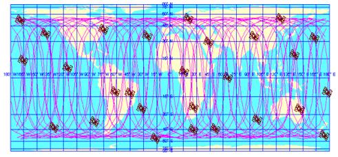 Acest grafic arata traiectoriile satelitilor care fac turul complecta al Terei în 12 ore, deci de doua ori în 24 de ore. Receptorul poate afisa pozitia sa în functie de coordonate latitudine/longitudine, caroiaj UTM (Universal Transverse Mercator, dupa numele geografului flamand Gerhard Kremer, 1512 - 1594, cunoscut sur numele Mercator Gerardus, unde fiecare patrat are o latura de 50 de km. Aici, ca exemplu, partea sudica a Finlandei), coordonate militare (MG, Military Grid, detaliu partial Europa) sau doar ca un punct pe o harta electronica.