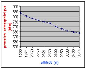 Graficul indica variatiunea presiunii între locul de plecare (1500m) si vârful Pic de Neige Cordier (3614m). La Mamaia presiunea este de 1013 hPa, la Medias de 1001.5 hPa, pe Moldoveanu de 746 hPa, Mont Blanc de 541 hPa si Everest doar 331 hPa. Cea mai înalta presiune înregsitrata a fost de 1083 hPa în 31 decembrie 1968 la Agata (Siberia), iar cea mai joasa în inima tifonului Joan, Filipne, 870 hPa în14 octombrie 1970. Daca vrei sa stii care-i presiunea la tine acasa, du-te pe www.heavens-above.com/countries.asp unde vei gasi altitudinea statului tau, dupa care faci niste mici calcule. Hai noroc !
