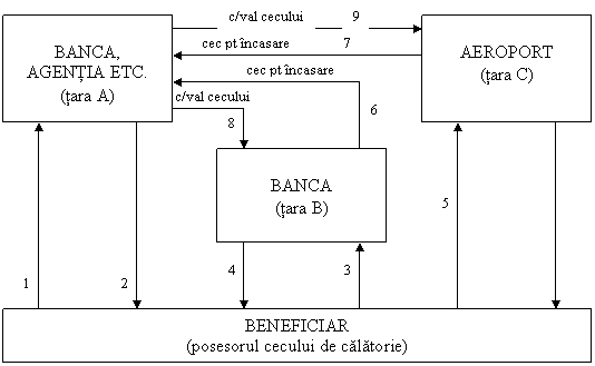 Mecanismul derularii platii prin cecuri de calatorie poate fi prezentat schematic astfel (sursa, Gabriela Stanciulescu, Managementul operatiunilor de turism, Editura ALL BECK, Bucuresti, 2003):
