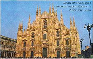 In Cetatea Vaticanului se viziteaza Piazza si Basilica San Pietro-cea mai mare biserica din lume pictata de Michelangelo.In Siena se admira Piazza del Campo,Palazzo Publico,Domul si Baptisteriul.In Florenta se impun Domul,Baptisteriul,Palazzo Vecchio,Ponte Vecchio,Galeriile Ufizzi.In Milano vizitam Galeria Vittorio Emanuele,Teatru Scala,Catedrala Santa Maria de la Grazie si Castelul Sforzesco.In Verona admiram Balconul Julietei si Teatrul Roman.