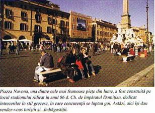 Pe terasele cafenelelor,turisti si romani de-a valma se racoresc cu minunatele inghetate italienesti si beau picatura cu picatura cafeaua minuscule,extrem de tare,facuta la filtru.Romanii sunt oameni aparte :extraordinar de deschisi,veseli,generosi si in acelasi timp cunoscandu-si foarte bine interesele,blazati,chiar cinici ;oameni ai unei culturi milenare,stranepotii unor popoare care au cunoscut puterea suprema si umilintele supreme,victoriile si infrangerile,trairea pasionala a credintei si ascutisul rece al gandirii abstracte.Un popor fermecator.