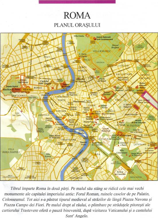 Raul Tibru imparte Roma in doua parti.Pemalul sau stang se ridica cele mai vechi monumente ale capitalei imperiului antic :Forul Roman,ruinele caselor de pe Palatin,Colosseumul.Tot aici s-a pastrat tiparul medieval al strazilor de langa Piazza Navona si Piazza Campo dei Fiori.Pe malul drept al raului,o plimbare pe straduletele pitoresti ale cartierului Trastevere ofera o pauza binevenita,dupa vizitarea Vaticanului si a castelului Sant’ Angelo.