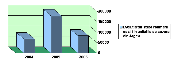 In anul 2005 fata de anul 2004 se poate vedea o evolutie ascendenta de 0.20 ori iar in anul 2006 fata de anul 2004 de 0.02 ori a numarului de turisti romani sositi in unitatile turistice de cazare din Arges.