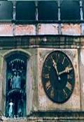 Cel mai mare turn, mândria orasului, Turnul cu ceas cu înaltimea ei actuala de 64 m dateaza din secolul al XIV-lea. Zidurile ei groase de 2 m aparau depozitele de munitii, arhiva si trezoreria orasului, si se mândrea cu un mecanism de ceas de lemn, care în anul 1648 a fost înlocuit cu unul metalic. Atunci au aparut si grupurile de statuete din lemn, care simbolizeaza zilele saptamânii. Ţiglele multicolore sunt din anul 1894. Pâna în anul 1556, la primul etaj a fost sediul primariei orasului. Din anul 1899 Turnul cu ceas adaposteste muzeul de istorie al orasului