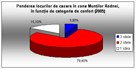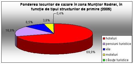 Muntii Rodnei ofera turistilor 2773 locuri de cazare repartizate in hoteluri, moteluri, pensiuni turistice, vile si casute (Tabelul nr. 3.1.).