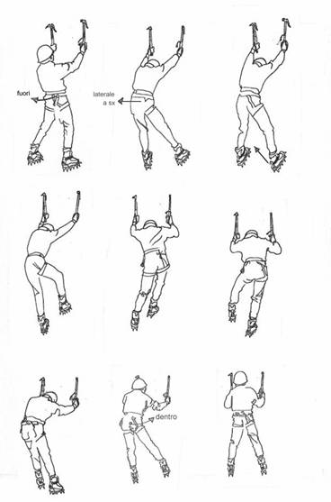 Efectuati 3 pasi mici, primul fiind plasat vertical pe centrul de greutate (pentru a nu se afla niciodata în dezechilibru), pâna ajungeti cu fata la înaltimea capului pioletilor. De fiecare data când un coltar e înfipt, trebuie sa urcati pâna când piciorul e întins înainte de a-l înfige pe celalalt. Astfel, bratele se închid progresiv.