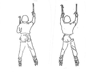 Bratul de sus, pe care îl putem numi "brat principal", trebuie sa fie în pozitia semi-întins, celalalt piolet mai jos, fara sa contribuie la mentinerea echilibrului.