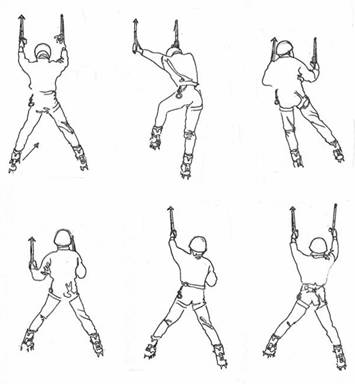 -Proiectarea bratului nu trece printr-o linie care leaga bazinul si centrul picioarelor (un triunghi isoscel sau un V invers), ci pe unul din cele doua picioare de sprijin, favorizând rotatia corpului (fig.81 si 82) si putând usor sa antreneze o pierdere de echilibru.
