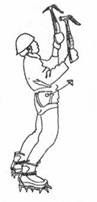 Picioarele se aseaza la acelasi nivel, pioletul e înfipt putin deasupra capului, de-a lungul unei axe imaginare care leaga capul, bazinul si centrul picioarelor (fig.76). Dupa ce ati înfipt pioletul deasupra capului, pozitionati picioarele astfel încât sa formeze un triunghi; picioarele sunt usor departate, genunchii îndoiti. Bazinul e împins bine spre perete, bustul si umerii departati de perete (fig.77).