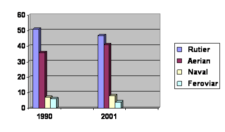 Referindu-ne la celelalte forme, transporturile navale au un rol mai important, ridicandu-se la 7-8% ceea ce arata o saturare a pietei, in timp ce transporturile feroviare cu toate eforturile de modernizare, se mentin la o cota relativ scazuta (3-4%) si pe o tendinta descrescatoare. (vezi fig.)