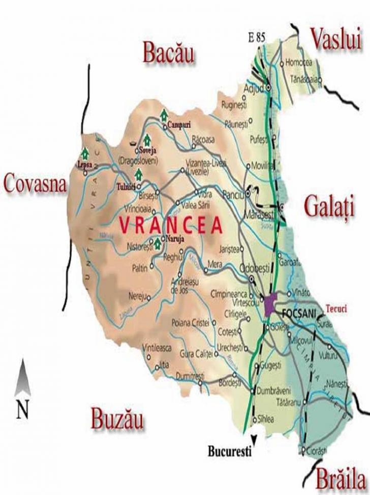 Pe harta Romaniei - judetul Vrancea poate fi identificat in zona sud-est, cuprins intre coordonatele geografice 45°23 ´ si 46°11 ´ latitudine nordica si 26° 23´ si 27° 32´ longitudine estica, se invecineaza cu judetul Bacau, la nord, judetul Buzau, la sud - vest, la est cu judetele Vaslui si Galati si judetul Covasna la vest, judetul Vrancea se intinde pe 4857 km 2 reprezentand 2 % din suprafata tarii, ocupand locul 30 pe tara ca suprafata si locul 7 ca suprafata rurala. Reteaua de localitati cuprinde doua municipii, Focsani si Adjud, orasele Odobesti, Panciu, Marasesti si 59 de comune cu 331sate. Aceste localitati sunt distribuite in proportie de 53% in zona de ses si 47% in zona de deal si munte.