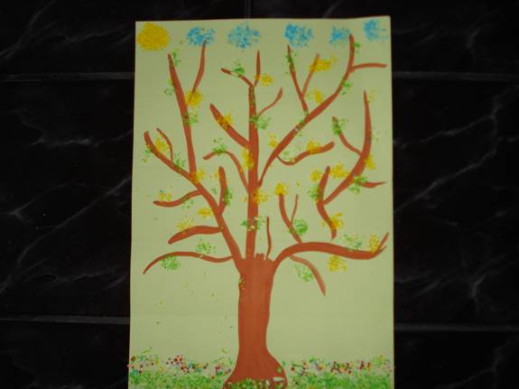 Tehnica de lucru: pe o coala de carton se picteaza un copac, pe crengile copacului se aplica lipici, iar peste lipici se presara razatura de cocos. Se foloseste cocos verde pentru frunze si iarba, albastru pentru nori, galben pentru soare si flori. Pentru a reprezenta florile din iarba am utilizat bombonele pentru ornat prajituri.