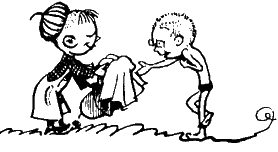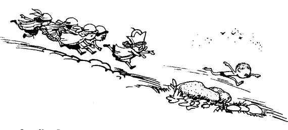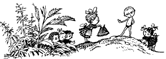 Dupa ce-l īmbraca cu greu, īncepu sa īntinda māinile, sa ridice picioarele, privindu-se din toatc partile. Vazāndu-l pe Pilula īntr-un vesmānt atāt de neobisnuit, Habarnam pufni īn rās. Dupa el se luara si ceilalti prichindei.