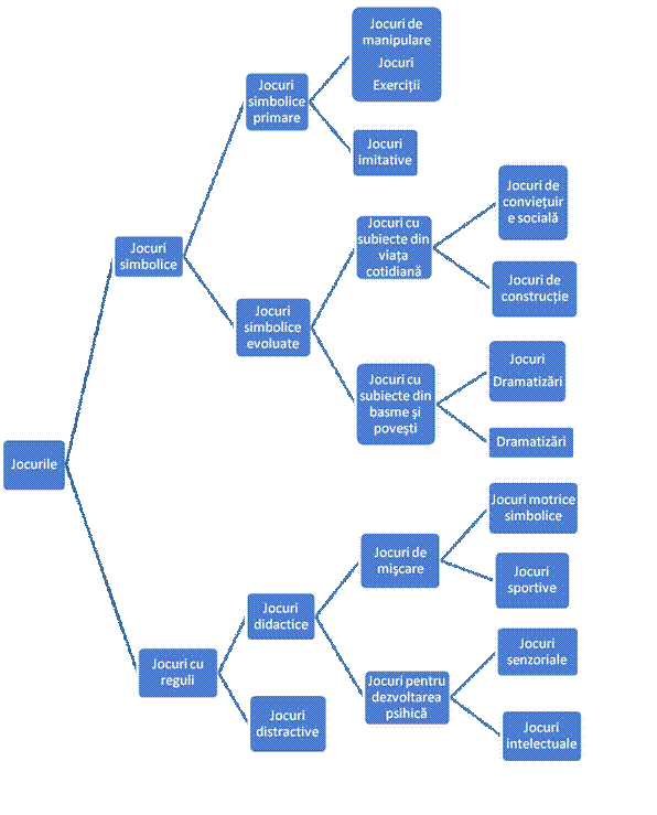 Ø jocul cu reguli apare in stadiul gandirii preoperatorii (2-7 ani). Are un rol deosebit in socializarea copilului, deoarece realizeaza intelegerea reciproca prin intermediul cuvantului si disciplinei;