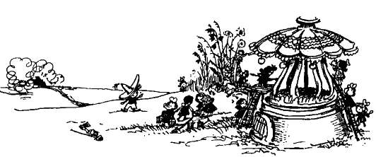 Acuarela decora foisorul cu cele mai ingenioase desene, iar ceilalti prichindei vopseau chioscurile în toate culorile curcubeului. Prichindutele împodobeau ringul cu flori, stegulete colorate si lampioane. Habarnam alerga de colo-colo si dadea ordine. I se parea ca munca se desfasoara prea încet. Striga, se agita si nu facea decât sa-i încurce pe ceilalti. Din fericire, fiecare stia si fara el ce are de facut.