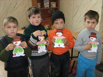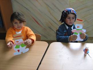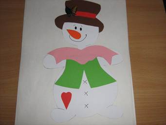 se decupeaza omul de zapada, bluzita,fundita,inimioara, bentita de la palarie, nasul si palaria. La palarie aveti grija , linia punctata o decupati , cand veti ansambla capul omului de zapada o sa -l introduceti inauntrul palariei.