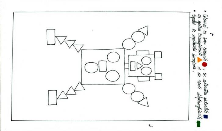 "Copii, piesele geometrice sunt foarte necajite astazi pentru ca s-au ratacit si nu mai stiu unde le este casuta in care pot sa locuiasca. Eu le-am pregatit niste casute ca sa nu se mai rataceasca alta data, dar acum ele nu-si mai amintesc unde au locuit. Vreti sa le ajutam? Pentru asta ne vom juca astazi jocul "Pune-ma la casuta mea". 2+3 copii repeta titlul jocului. |