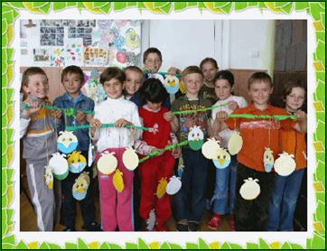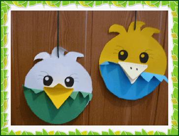 Se copiaza anexa. Se decupeaza, pe linia punctata, puisorul, coaja de ou si ciocul. Se îndoieste ciocul, din ambele parti, pe linia întrerupta. Se lipeste numai pe micul dreptunghi obtinut dupa îndoire. Se lipeste coaja si de îndoiesc sau nu marginile crestate. Se îmbraca batul cu hârtie creponata sau se vopseste cu acuarele. Se introduce acul cu un capat al firului prin creasta puitorului, iar celalalt capat se leaga pe bat.