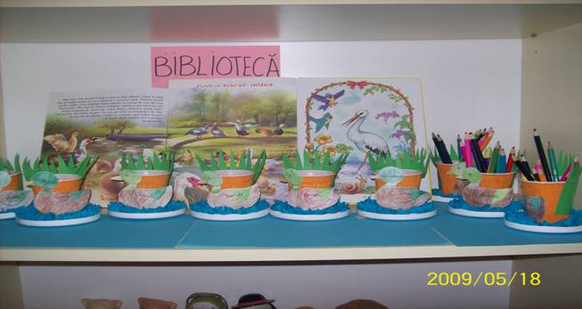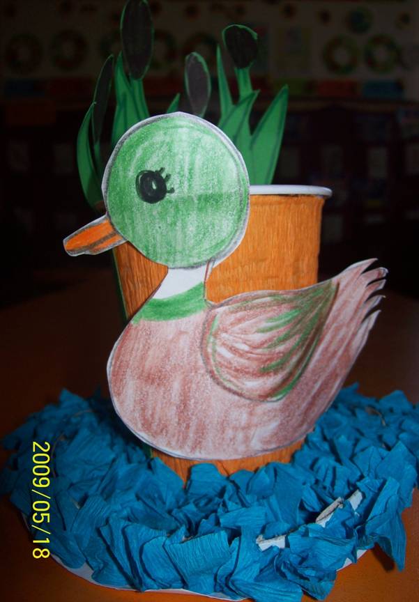 Paharele au fost invelite in hartia creponata de catre mine astfel incat si fundul paharului sa fie invelit pentru a putea fi lipit pe capacul cutiei de branza topita. In mijlocul capacului se traseaza conturul fundului paharului, in jurul lui copiii aplicand lipici si realizand lacul prin aplicarea bucatelelor de hartie creponata. Fiecare bucatica de hartie se aseaza pe capatul creionului si se lipeste cu ajutorul acestuia in capac. Pe pahar se aplica stufarisul si ratusca anterior colorata si decupata. Cand lacul este gata se lipeste si paharul in mijloc si suportul de creioane este gata!