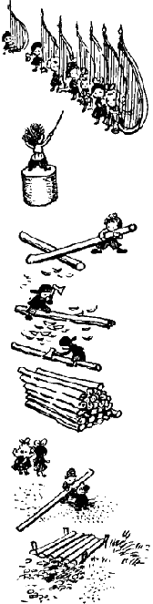 Se apucara toti cu râvna de pregatirile pentru bal. Unii curatau ringul de dans, adica un loc rotund pe care-l napadise iarba, altii asezau în jurul ringului banci. Zapacila, Tacutul si Cuisor, înarmati cu topoare, se apucara sa ridice, alaturi de ring, un foisor cu etaj pentru orchestra. Alti prichindei construiau chioscuri pentru apa minerala, înghetata si alte dulciuri. Toata munca asta se desfasura în sunetul muzicii, deoarece Gusla alesese zece harpiste dintre cele mai talentate si organizase o orchestra. Începura imediat si repetitiile.