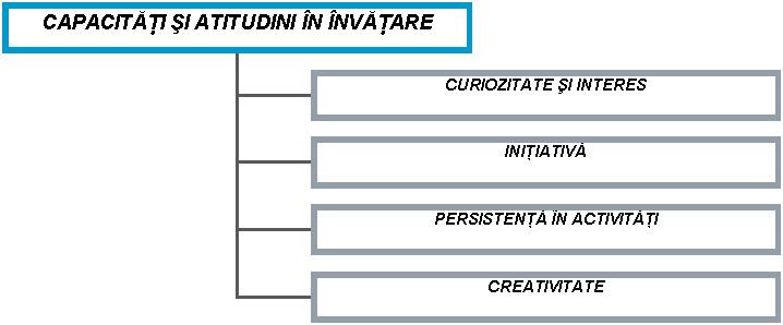 C. ATITUDINEA ÎN ÎNVĂŢARE - se refera la modul în care copilul se implica într-o activitate de învatare, modul în care abordeaza sarcinile si contextele de învatare, precum si la atitudinea sa în interactiunea cu mediul si persoanele din jur, în afara deprinderilor si abilitatilor mentionate în cadrul celorlalte domenii de dezvoltare.