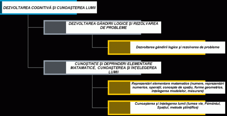 E. DEZVOLTAREA COGNITIVĂ sI CUNOAsTEREA LUMII - a fost definita în termenii abilitatii copilului de a întelege relatiile dintre obiecte, fenomene, evenimente si persoane, dincolo de caracteristicile lor fizice. Domeniul include ablitatile de gîndire logica si rezolvare de probleme, cunostinte elementare matematice ale copilului si cele referitoare la lume si mediul înconjurator.