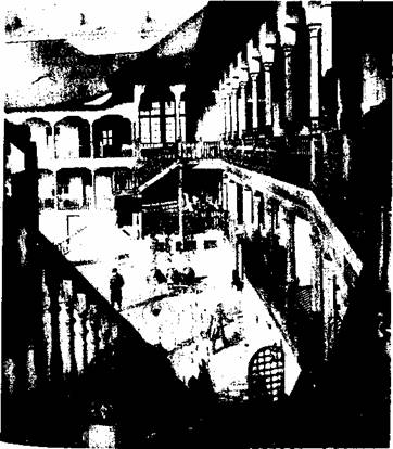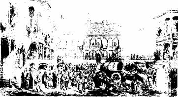 Hanul Manuc la mijlocul secolului trecut, dupa un desen de Lancelot.
