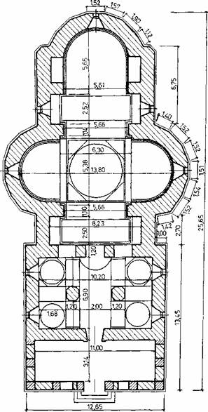Planul arhitectural de tip clasic grecesc īnscris, amplificat lateral cu abside, seamana īntrucītva cu cel al bisericilor de la Muntele Athos.